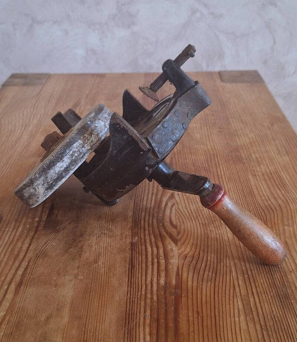 Cette meule à aiguiser ancienne, équipée d’une manivelle et d’un système de fixation sur établi, est un authentique outil d’artisan. Utilisée autrefois par les couteliers, remouleurs et artisans, elle permettait d’affûter lames, couteaux et outils tranchants avec précision.
