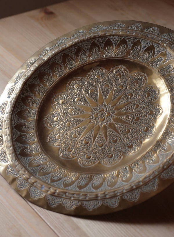Utilisée comme élément décoratif mural ou comme plateau de présentation, elle incarne un art de vivre raffiné et exotique. La richesse de ses ornements et la patine chaleureuse de son métal en font une pièce unique, parfaite pour donner une touche d’authenticité à tout intérieur.